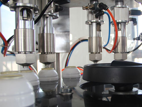 氣霧劑灌裝機結構上主要有灌液機、封口機、充氣機、增壓泵、臺面、機架及氣動元件組成。灌液機由液體計量缸和灌液頭組成,充氣機由氣體計量缸和充氣頭組成。液體計量缸和氣體計量缸固定在臺面上靠后的位置,灌液頭、封口機和充氣頭分別安裝在獨立的升降立柱臺板上,根據罐子的高度不同方便上下調節。增壓泵采用最新雙進雙出式的高效模式。